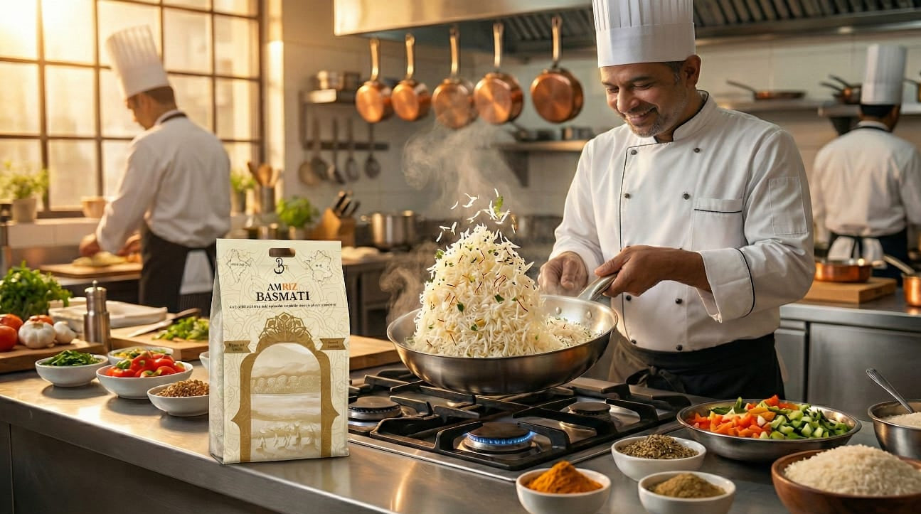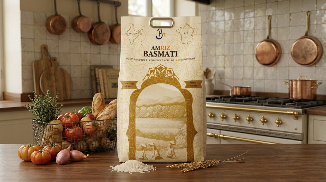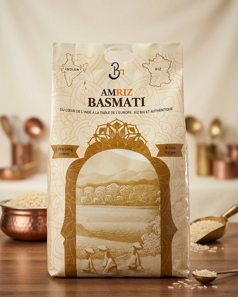 Découvrez le vrai goût de l'Inde avec le Riz Basmati AMRIZ — naturellement vieilli, aux grains extra-longs qui cuisent à la perfection. Moelleux, aromatique et authentiquement cultivé dans les contreforts de l'Himalaya, c'est l'essence de chaque délice fait maison.